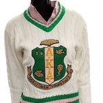 Tackle-twill V-neck sweater with embroidered elbow pads.