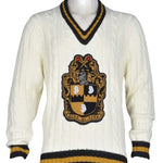 Tackle-twill V-neck sweater with embroidered elbow pads.