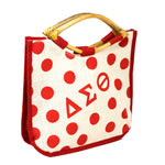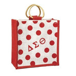 Curved Polka Dot Jute Bag. 15" width w/tapering to 14.5" width at the top. 13" height with a 5" side/bottom gusset.