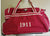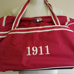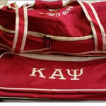 Two-wheeled trolley bag with detachable cross-body strap as well as a pull out handle.