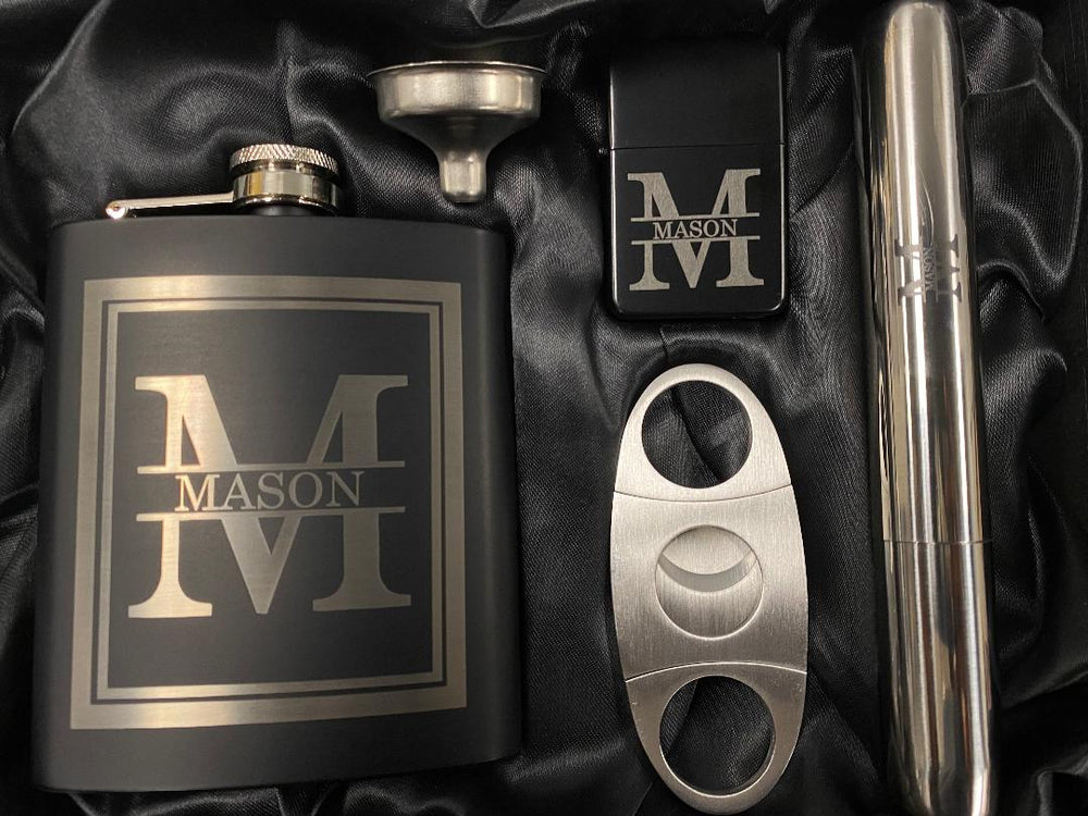 Flask w/funnel, Cigar Holder, Cigar Cutter, Lighter