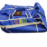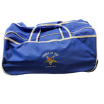 Two-wheeled trolley bag with detachable cross-body strap as well as a pull out handle.