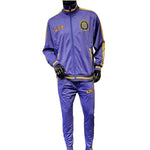 Pants feature embroidered symbols on the thigh with a solid contrasting stripe down the leg