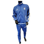 Pants feature embroidered symbols on the thigh with a solid contrasting stripe down the leg
