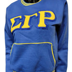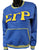 Sweatshirt showcasing embroidered chenille Greek letters, crew neckline for a non-restrictive fit, ribbed collar and cuffs, improve durability