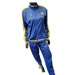 Pants feature embroidered symbols on the thigh with a solid contrasting stripe down the leg