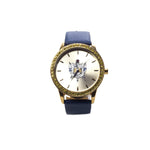 Genuine leather band, sorority watch with rounded face; water-resistant case. Three hand analog display with quartz movement. Band features an adjustable buckle closure. Watch face features Sorority Shield.