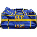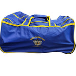 Two-wheeled trolley bag with detachable cross-body strap as well as a pull out handle.