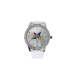 Genuine leather band, sorority watch with rounded face; water-resistant case. Three hand analog display with quartz movement. Band features an adjustable buckle closure. Watch face features crest.