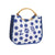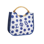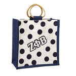 Curved Polka Dot Jute Bag. 15" width w/tapering to 14.5" width at the top. 13" height with a 5" side/bottom gusset.